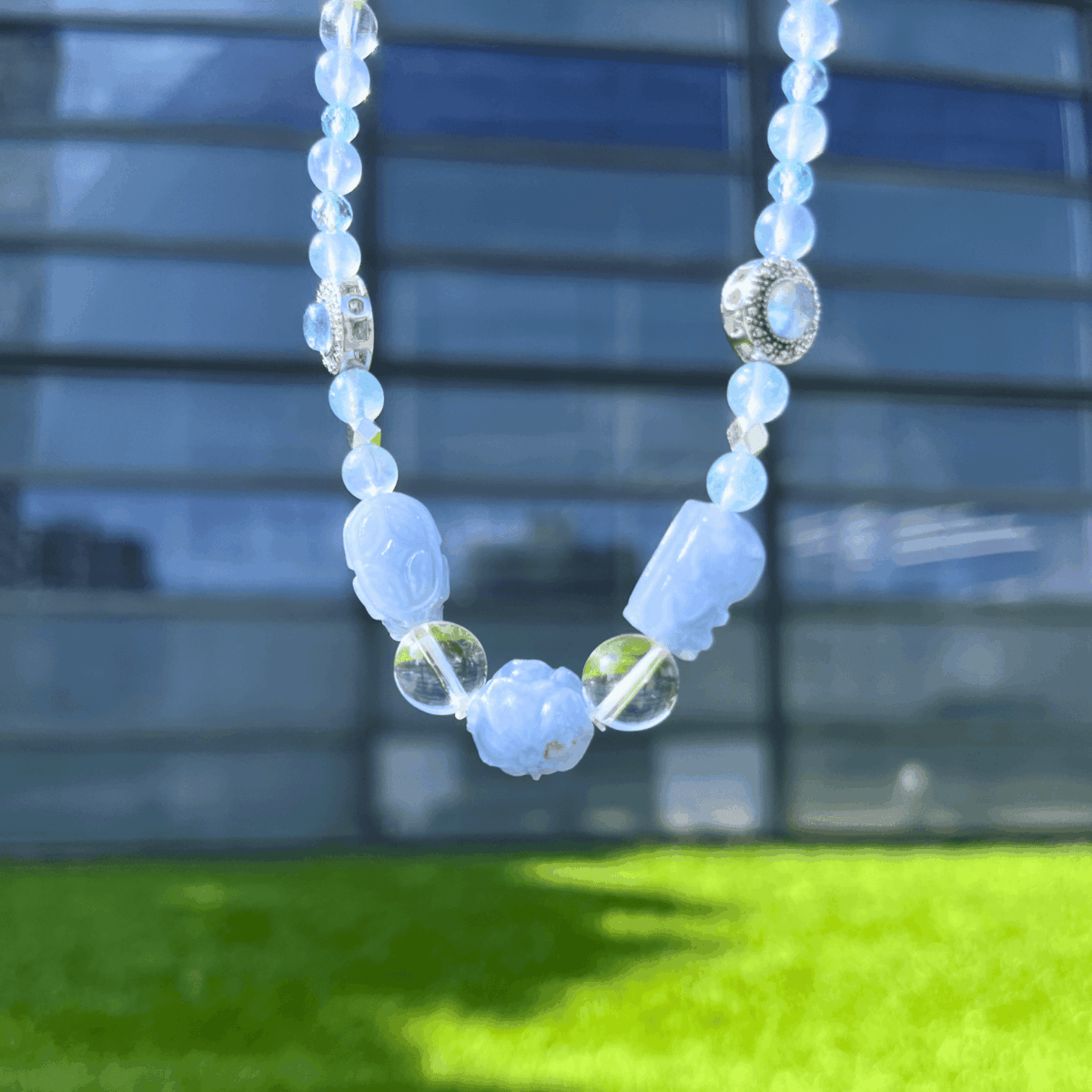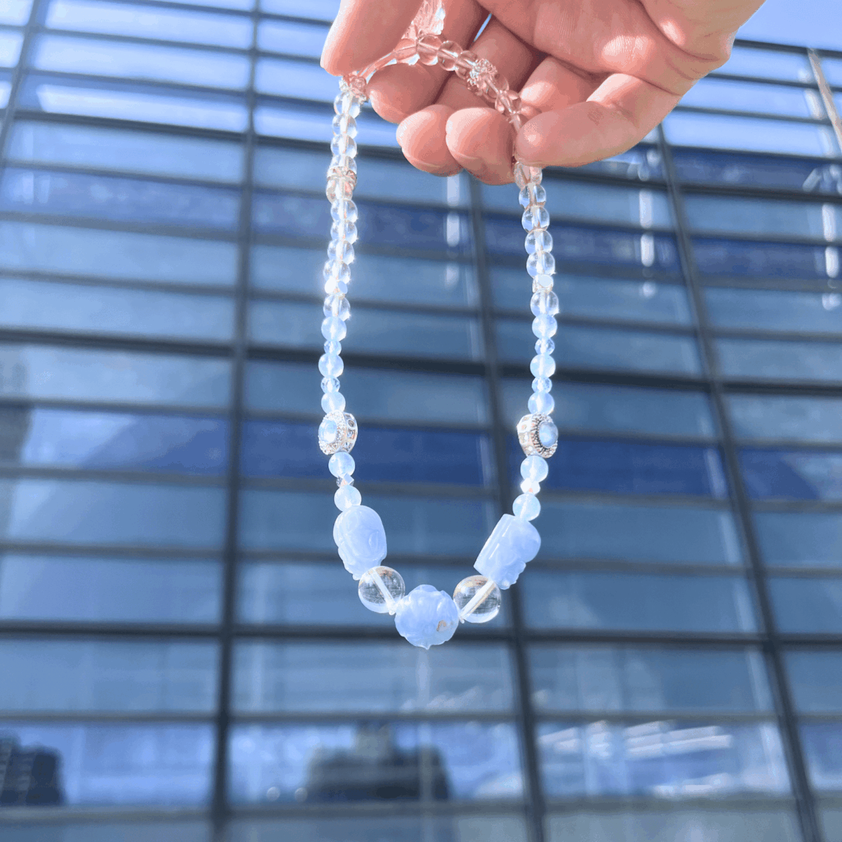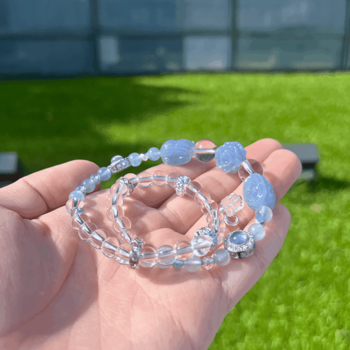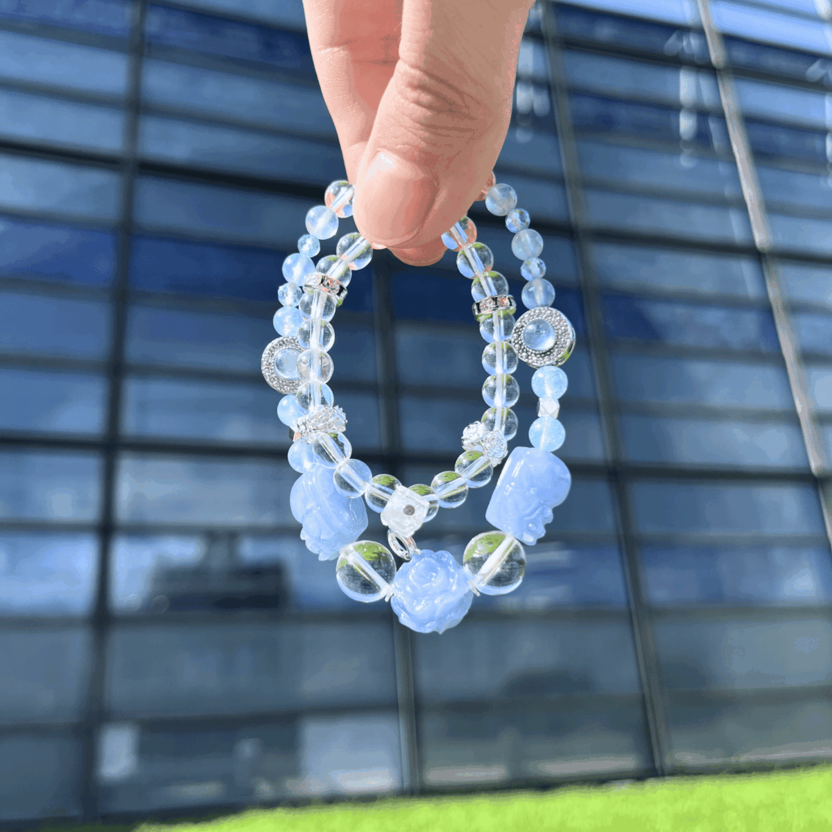 選用海藍寶與藍玉髓提升溝通力與情緒流動,協助打開人緣與連結能力。與客戶自備的開運黃金飾品中重新編織,不僅保留原始的紀念價值,也形成金水能量的和諧循環。